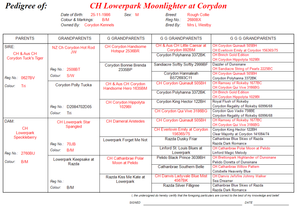 He will go down in history because his daughter CORYDON MOON GODDESS was the dam of the breed CC record holder Ch Pheelancer Phrosty Moon Over Corydon. We called him Speks because when we bought him in at 8 weeks it looked as if he had dark glasses round his eyes. We did an exchange of puppies with his breeder. His pedigree is impressive.