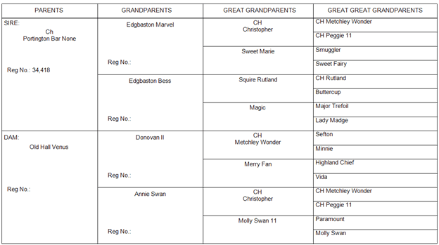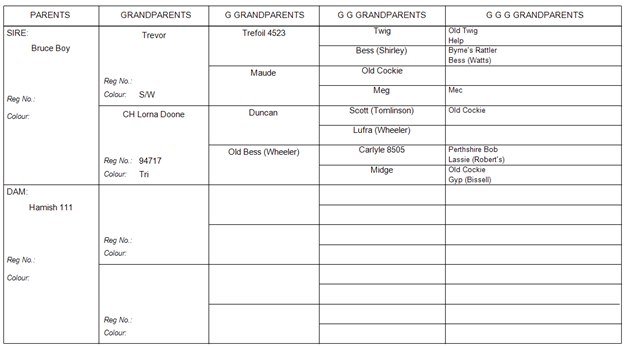 One bitch that I have studied was called Nell an unregistered bitch born about 1900. She did not produce any bitches, but her reverse pedigree goes on for ever as she was the dam of two or three very popular dogs. Although she did not have a female line she was without doubt a very important bitch in her time. Her main son was Ch Balgreggie Hope that started the Old Hall kennel.