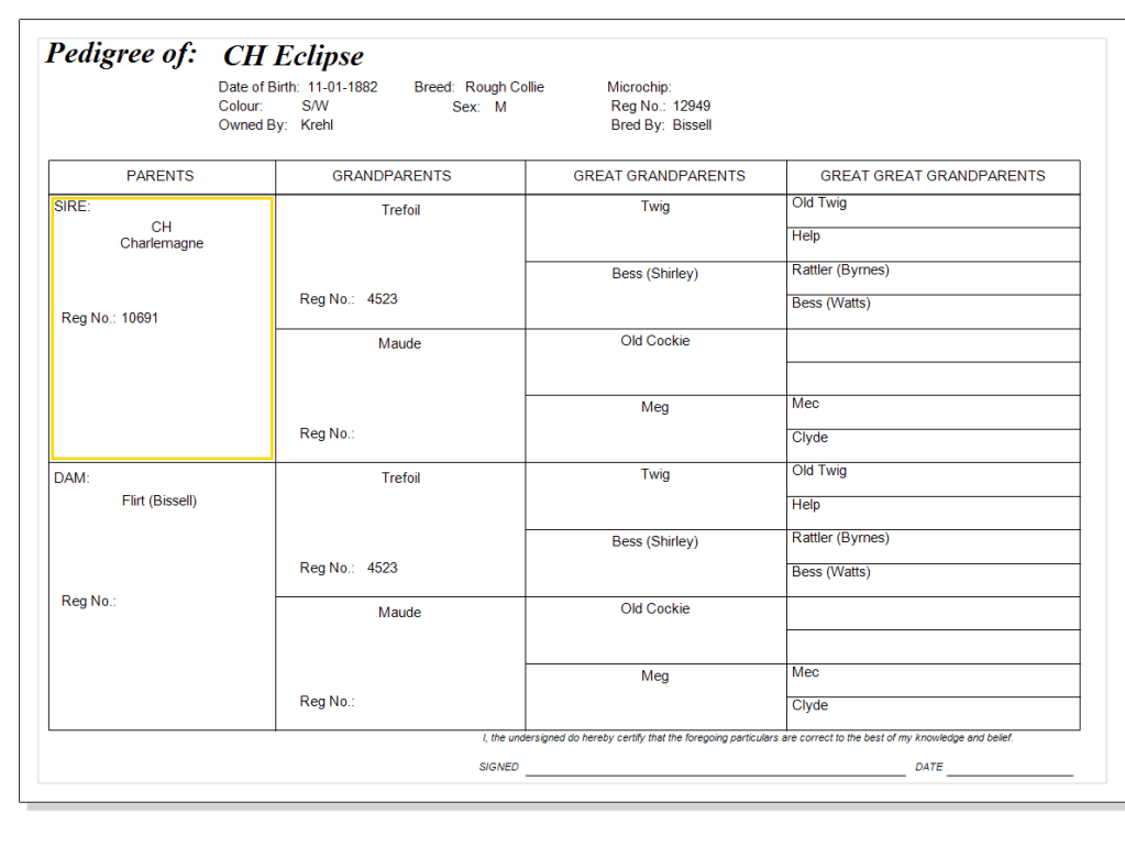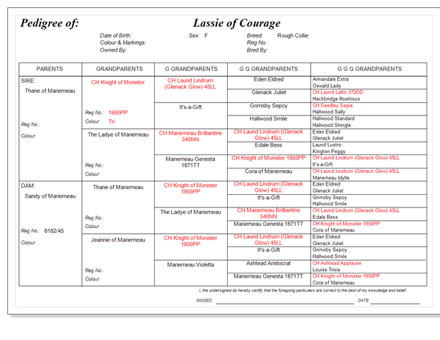 I have found some lines that have carried on for 150 years which is quite remarkable. What is also remarkable is that some Collies appear in far distant pedigrees thousands of times. My program will do a thirty five generation pedigree and this will contain many millions of Collies. A popular dog in those early days will appear quite frequently.