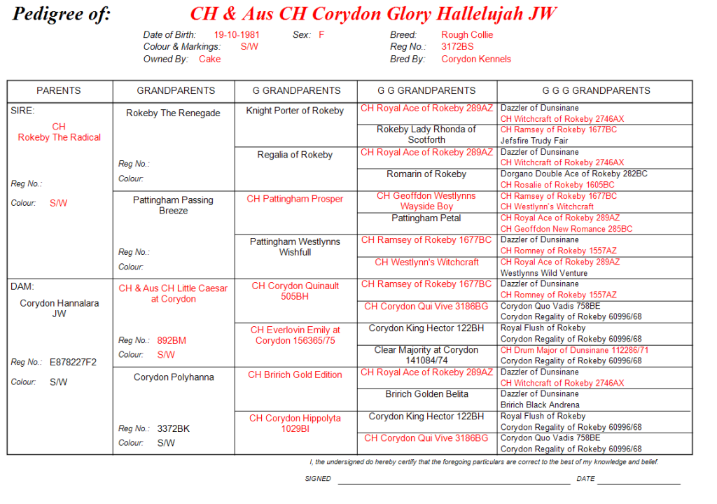 She had an outstanding career in the show ring down under. She then went to New Zealand to have a litter by NZ Ch Corydon Hotrod. From this litter there were at least five Champions. She then returned to the Cakes. We saw her in 1987 and she looked wonderful.
