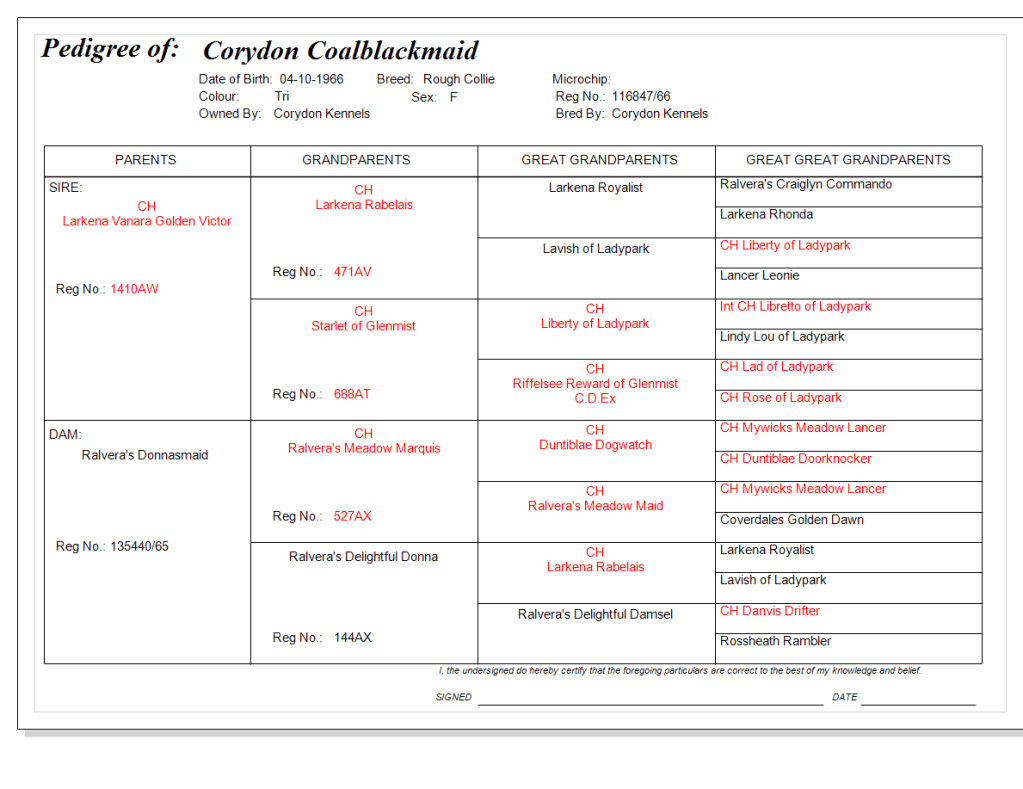 She had 7 litters and reared all 48 puppies born. Dam of Corydon Quo Vadis the sire of Ch Corydon Qui Vive. also dam of Corydon Old King Cole CC winner and Aus Ch Corydon Cornflower