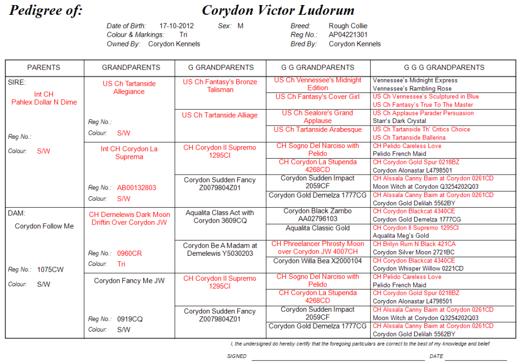 His Grandsire US Ch Tartanside Allegiance is considered to be one of the very best sires of the breed in the USA. His sire US Ch Fantasy’s Bronze Talisman is the most successful sire off all time in the USA.