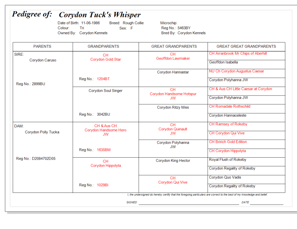 She only had one litter but her reverse pedigree is impresive. Her Best in Show win:- 27/3/1988 – Collie Association Open Show. – Judge Mr I Brazier.