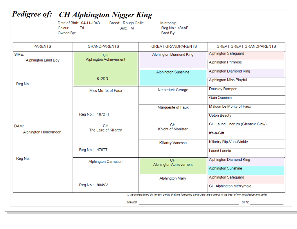 Just for fun I have put here a 4 generation pedigree of Ch Alphington Nigger King. It is a good example of line breeding that resulted in a very good Rough Collie Champion dog. His name would not be allowed today, quite rightly